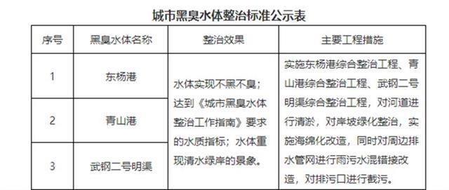 城市黑臭水體整治標(biāo)準(zhǔn)公示顯示,東楊港、青山港和武鋼二號(hào)明渠整治效果達(dá)到水體實(shí)現(xiàn)不黑不臭;達(dá)到《城市黑臭水體整治工作指南》要求的水質(zhì)指標(biāo);水體重現(xiàn)清水綠岸的景象。主要工程措施包括:實(shí)施東楊港綜合整治工程、青山港綜合整治工程、武鋼二號(hào)明渠綜合整治工程,對(duì)河道進(jìn)行清淤,對(duì)岸坡綠化整治,實(shí)施海綿化改造,同時(shí)對(duì)周邊排水管網(wǎng)進(jìn)行雨污水混錯(cuò)接改造,對(duì)排污口進(jìn)行截污。