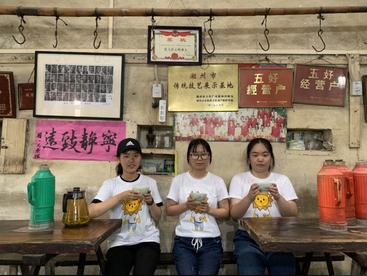 圖為調(diào)研團隊部分成員手捧茶館內(nèi)泡好的枸杞子熏豆茶的合照。一元茶館已有百年歷史,三人身后古老泛黃的墻壁上記錄了這座茶館的榮譽和故事。 何雪 攝